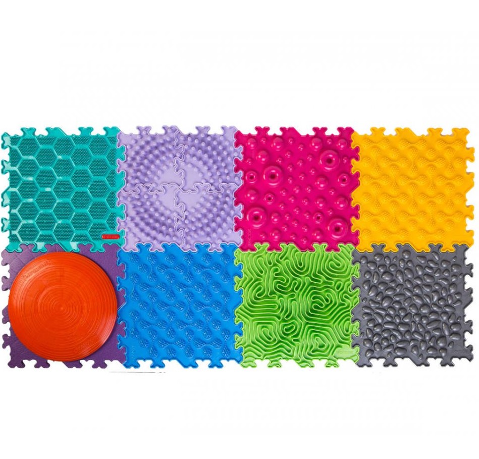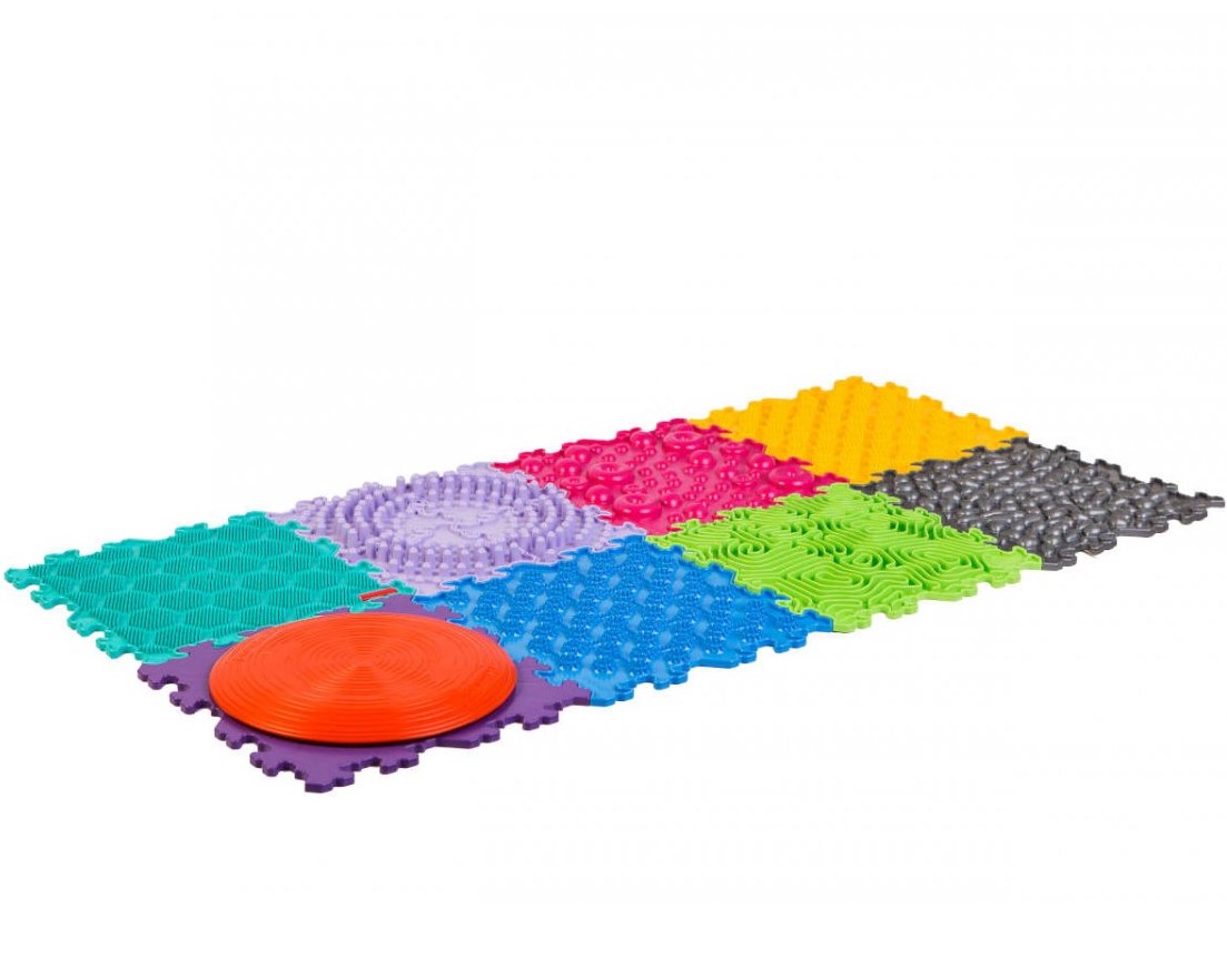 Коврик из модулей с разными фактурами позволяет заниматься физкультурой, играть с детьми и релаксировать. Интегрированный в набор диск здоровья - это тренажер для укрепления мышц живота и развитие подвижности позвоночника.