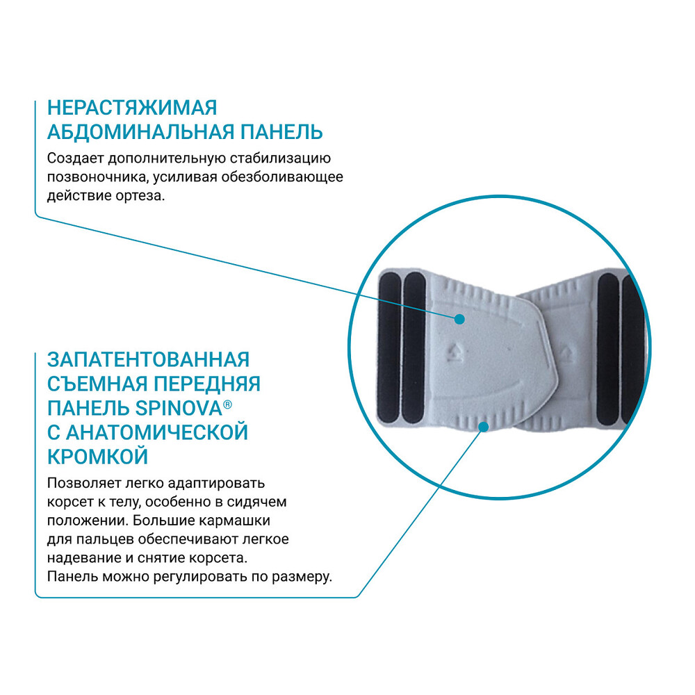 запатентованная абдоминальная панель Spinova®Classic с анатомической кромкой позволяет ортезу адаптироваться к контурам тела, особенно в сидячем положении; большие кармашки для пальцев обеспечивают лёгкое надевание и снятие изделия;