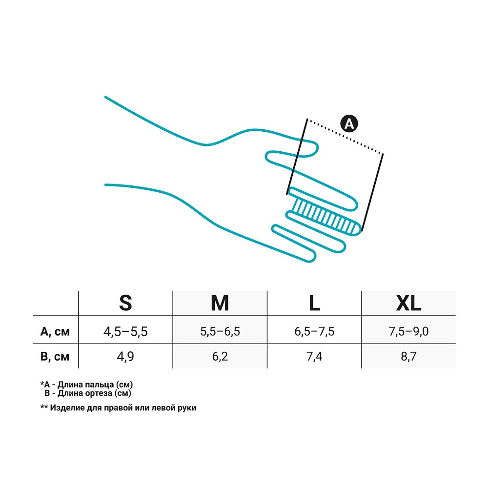 Для правильного выбора подходящего размера пястно-фалангового ортеза ORLETT FG-100 необходимо измерить длину пальца руки от проекции суставной щели пястно-фалангового сустава до кончика пальца. Согласно полученным результатам подобрать ортез по таблице подбора размеров. В зависимости от строения пальцев, характера травмы (заболевания), вида лечения может потребоваться индивидуальный подбор размера, отличный от рекомендованных. Точный размер ортеза определяет врач в соответствии с указанной длиной ортеза.